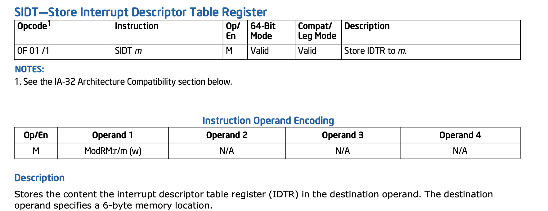 SIDT指令用于读取IDTR的内容到内存,常用于虚拟机检测和安全分析,且可在用户态执行。