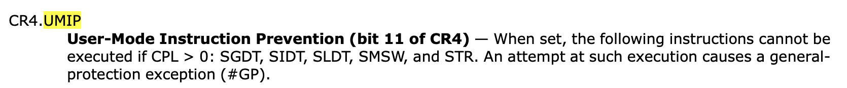 User-Mode Instruction Prevention (UMIP) is a security feature present in new Intel Processors. If enabled, it prevents the execution of certain instructions if the Current Privilege Level (CPL) is greater than 0. If these instructions were executed while in CPL > 0, user space applications could have access to system-wide settings such as the global and local descriptor tables, the task register and the interrupt descriptor table.