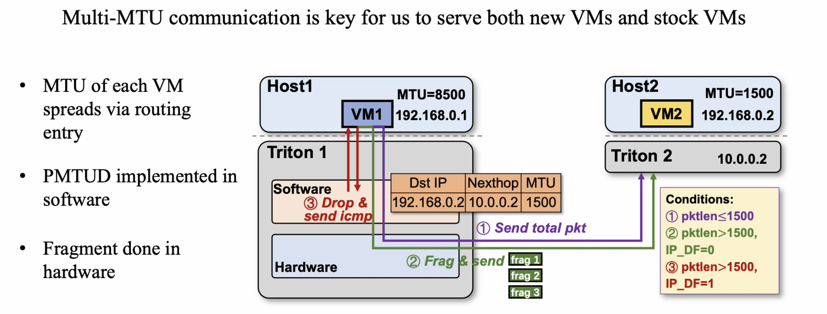 To tackle this, we introduces path MTU and new actions to AVS for ensuring network connectivity in multi-MTU scenarios. The controller attaches the path MTU when issuing routing entries to AVS, allowing awareness of the maximum acceptable MTU to the destination. Then AVS employs three new actions as RFC standards, for handling oversized packets. For a packet that is smaller than the path MTU, the AVS will forward the packet as usual. But when the packet is bigger than the path MTU, there will be two different treatments according to the standards. If the Don’t Fragment (DF) field in IP header is set to 1, the packet should be dropped and an ICMP message containing path MTU will be sent to the source VM to reduce packet length. This kind of action is complex and costs too much to generatea new packet in hardware, so we implement it in software AVS. But if the DF field is 0, the packet should be fragmented and sent out. The action is fixed and I/O related, thus is more suitable to be implemented in hardware for efficiency.