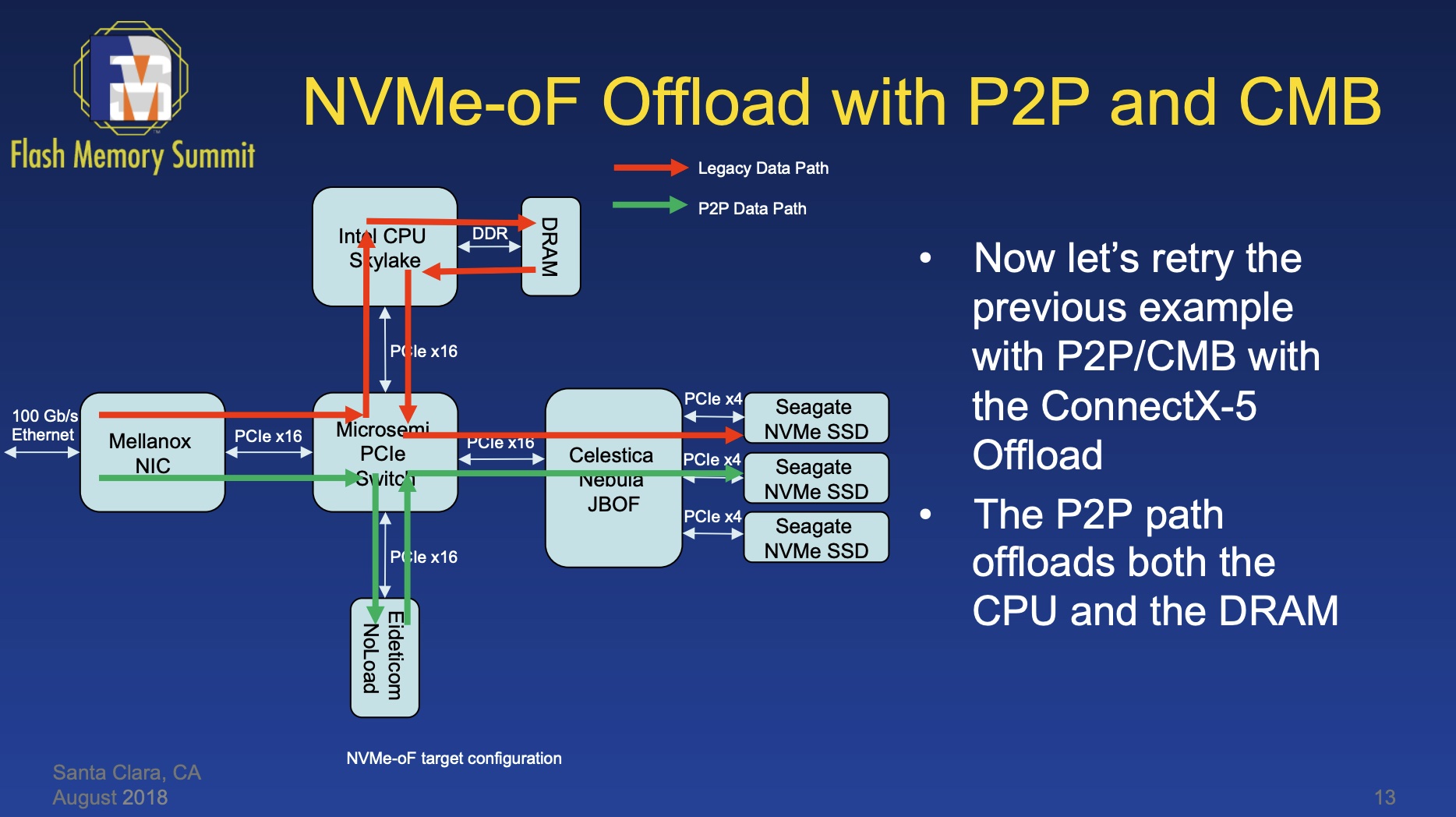 NVMe over Fabrics P2P ,如下图所示,黄色虚线是非P2P数据通信路径,绿色虚线是P2P的通信路径。