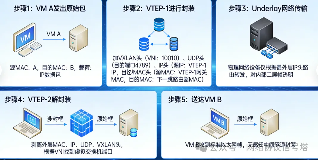 VXLAN是主流的overlay技术,通过“MAC in UDP”的封装方式,将二层以太网帧封装在 UDP 报文中,通过三层 IP 网络进行传输。