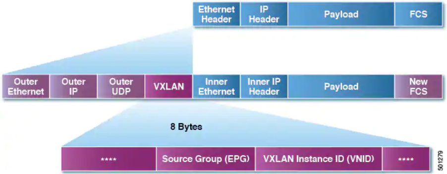 As shown in the preceding figure, a VXLAN tunnel endpoint (VTEP) encapsulates the following headers into the original Ethernet frame (original L2 frame) sent by a VM: