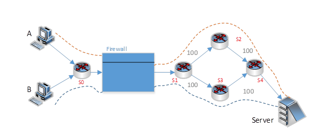 假设从S0到Server的路径为S0-S1-S2-S4(即图中橘色路径),那么即便存在另一条等价路径(即图中蓝色路径),路由器仍然会每次选择第一条橘色路径转发数据。除非此条路径发生拥塞,才会重新选择路径。
