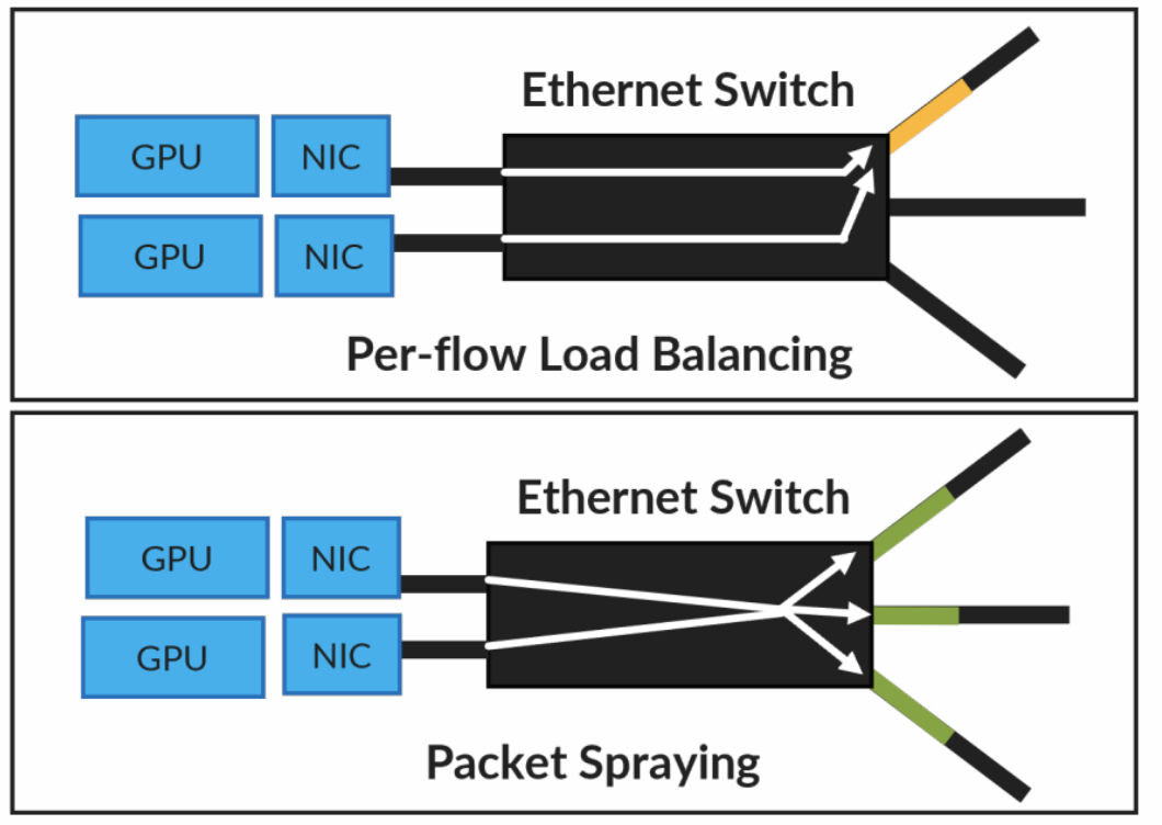 - packet spraying是packet粒度的Load Balance技术,粒度更细,但是会引入out-of-order packet delivery问题
