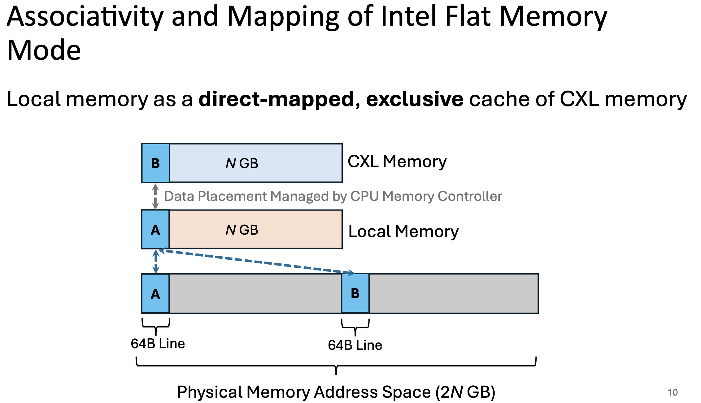 The associativity between physical memory and local memory is direct-mapped, which means each line in the physical memory address space can only be cached at one location in local memory.