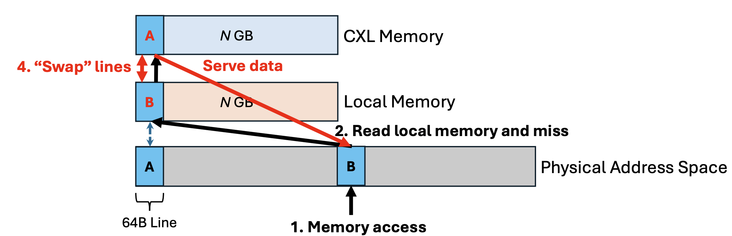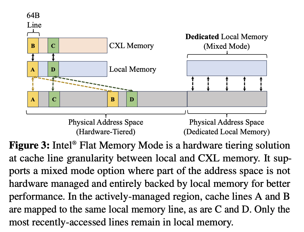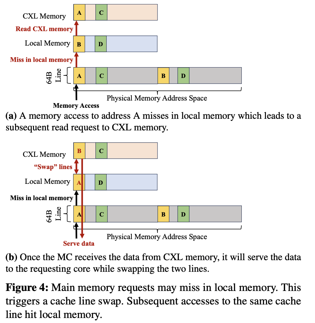 This design fully utilizes the capacity of both local DRAM and CXL memory by placing data exclusively at either of them, but not both. For example, once a cacheline is moved to local DRAM, it will no longer occupy any space in CXL memory.