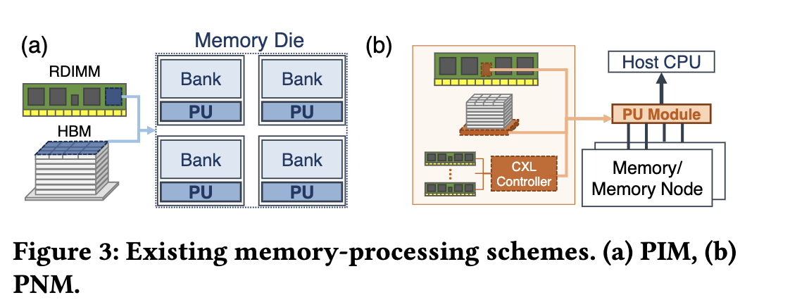 As shown in Figure 3 (a), PIM places a processing unit (PU) alongside each memory bank so that parallel computations can be implemented across all memory banks, exploiting the high internal memory bandwidth. A PU can be a MAC (Multiply and Accumulate) unit, a compute core, or a database query processor, specialized in workloads with low arithmetic intensity. However, due to the constraints stemming from the memory process technology applied for the memory core die, PIM logic faces inherent limitations in supporting more complex computations, thereby restricting it to wimpy processing units. On the other hand, as depicted in Figure 3 (b), PNM places processing modules not in the memory core but rather on the data read path between the host processor and the memory node or local main memory. Similar to PIM, PNM is also suitable for workloads with low arithmetic intensity. However, since PNM logic is fabricated using standard logic process nodes, it allows for a broader range of supported operations. Thus, one can fuse multiple kernels into a single module,and exploit high aggregate bandwidth for task-specific computations.